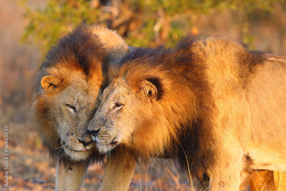 The Transvaal lion (Panthera leo melanochaita) or Panthera leo kruegeri, two males at greetings When checking the territory #169036311